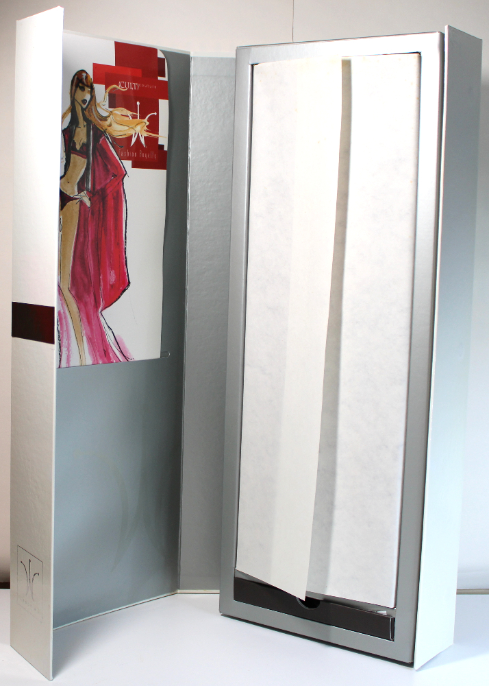 • PACKAGING – The white retail box with hinge-type fold-over lid and hidden magnetic side clasp is in good to excellent shape with no discernible flaws or dings. The paper liner has a small tear at the bottom. Shoes and earrings are stored inside the bottom pull-out drawer. Retail box comes wrapped in a clear plastic sleeve inside the original factory shipper box and, if shipped separately, will come wrapped in poly bags for discretion and protection.