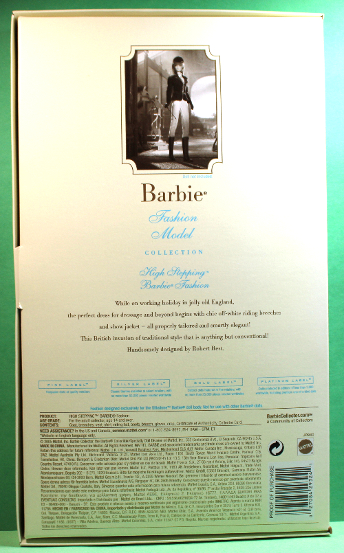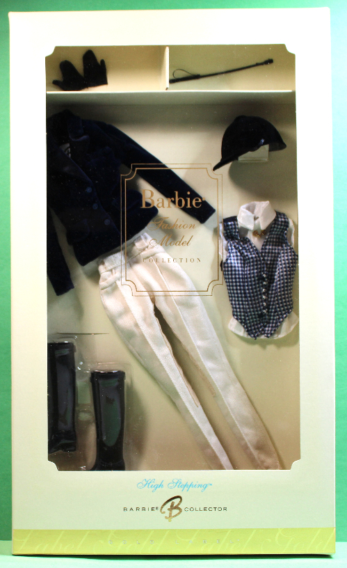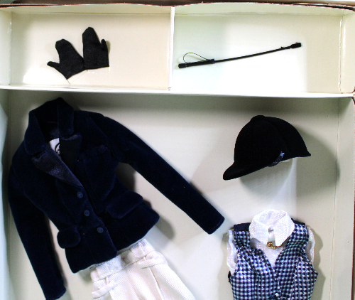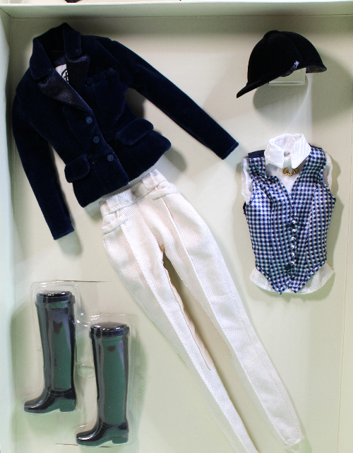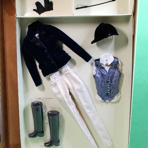 This impressive boxed set from the Silkstone Barbie Fashion Model Collection features everything a well-appointed gal needs for a jaunt in an English saddle for a dressage performance. The finely tailored and detailed items include: a show riding jacket, jodhpurs, shirt and vest, gloves, boots, helmet, and riding crop. Boxes are in two conditions: 1) In VERY GOOD to EXCELLENT condition with original factory tissue wrap and no discernable major creasing or flaws in the box, great for in-box display; or 2) In original box unopened, in GOOD condition with a slight crease on one side of box, a better choice if you’re going to unbox items. They’re priced differently so you can choose whether to buy the “keep in the box” or “unbox” selection.