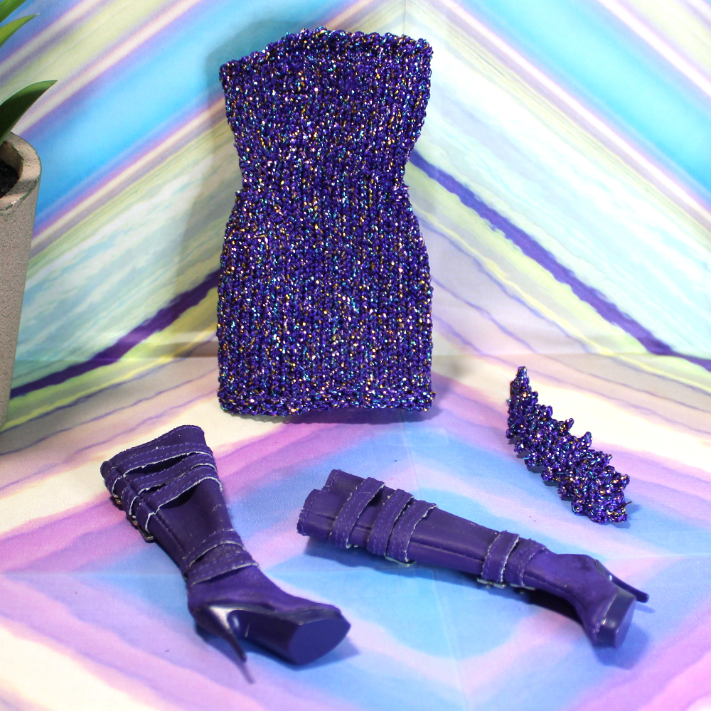 - DRESS – This subtly contoured strapless slip-on mini shift is hand-knitted in metallic purple thread with subtle multi-color pink, aqua, and gold accents. A pico-edge matching choker with back snap is included. This ensemble will fit a wide variety of standard fashion dolls, including ones with larger bust like Fashion Royalty.