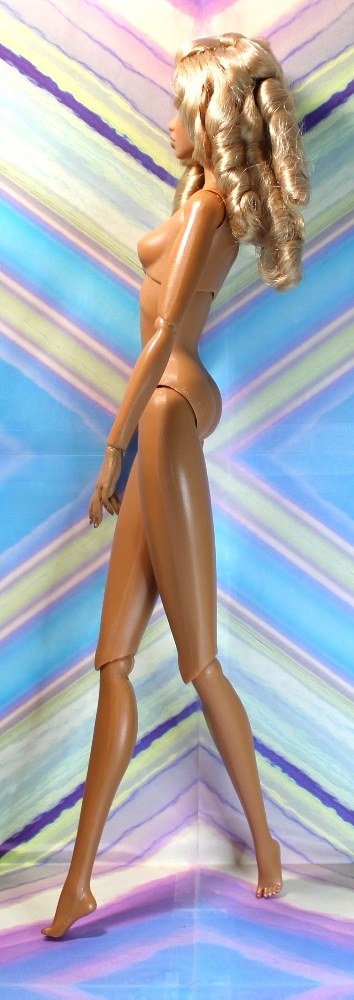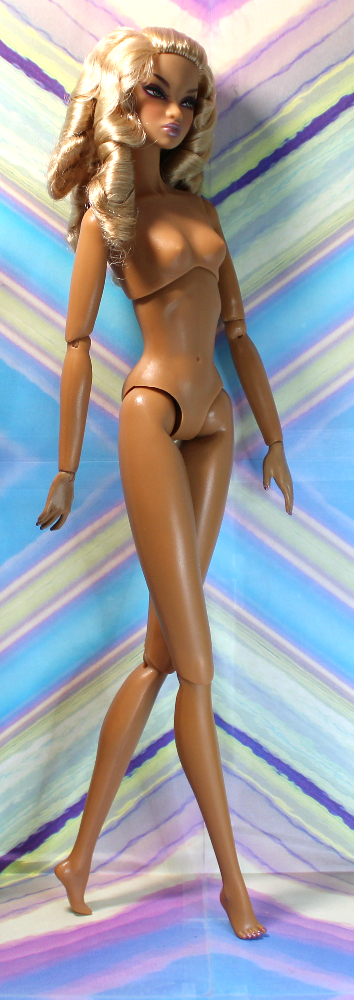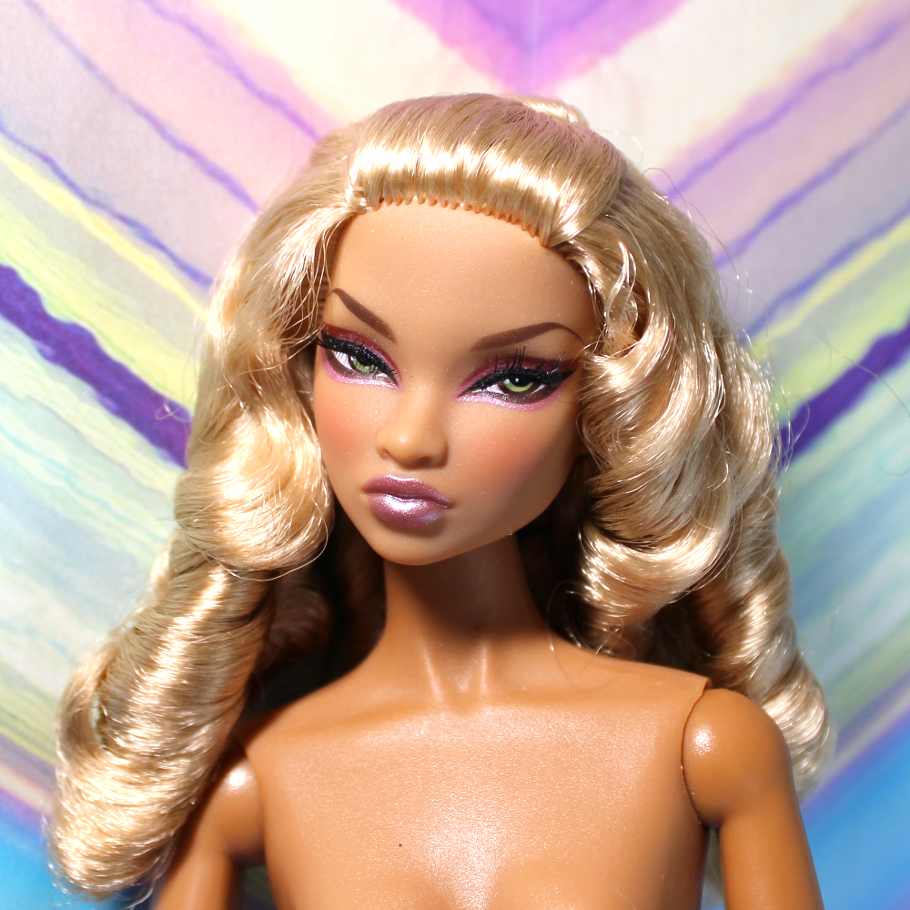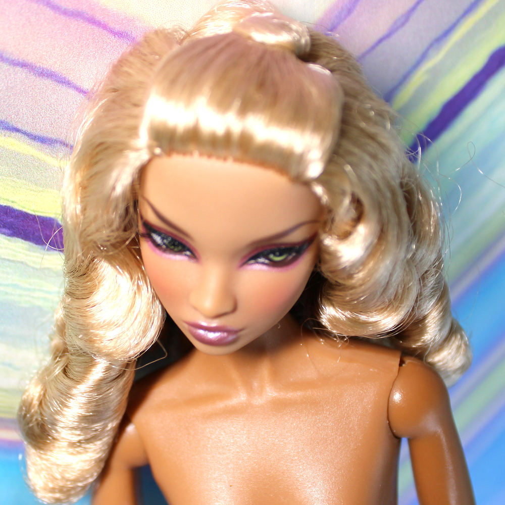REFURBISHED, REDRESSED. This exotic Colette Duranger doll has a medium-tan complexion, wide-set side-glancing green eyes, applied lashes in fairly good shape, pale pink metallic lip color, and metallic pink mani-pedi. Her mid-back-length platinum blond hair retains the original factory hairstyle with front pull-back half-pony and large banana curls. She has her original Model Behavior/NuFace body* with non-removable hands and split-toe high-heel feet. She comes with the following: