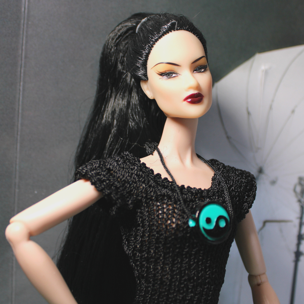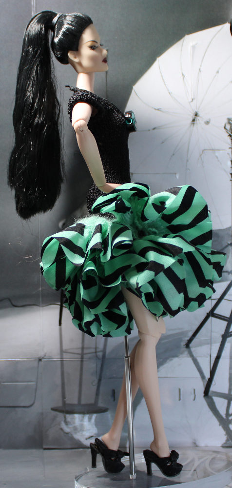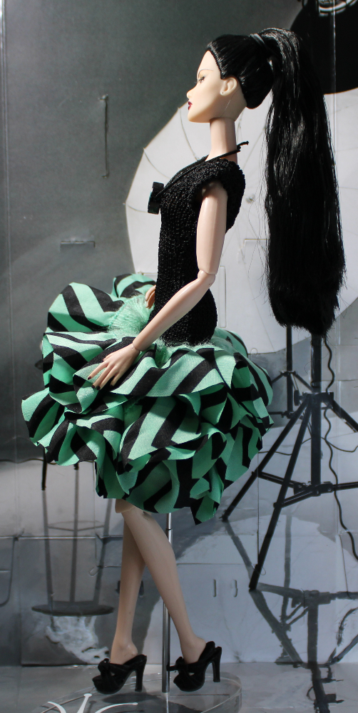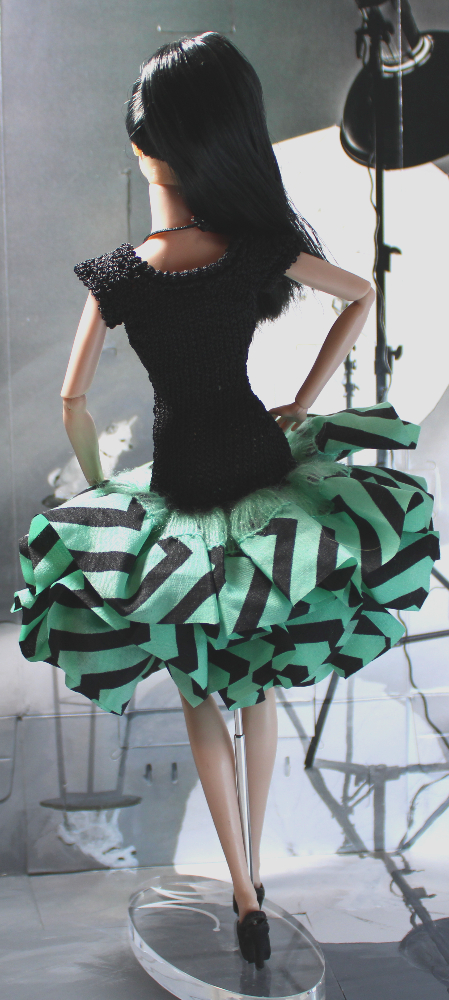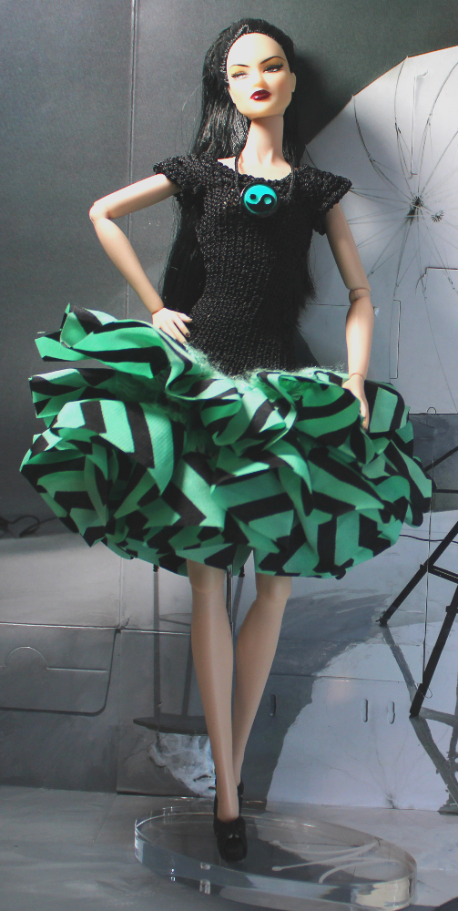 This form-fitting party dress features a knit black sleeveless high neckline bodice accentuated by a green and black chevron print fabric skirt ruffle with extra fluff and fullness. Comes with included bluish-green and black “Yin-Yang” bead necklace on black tied cord that slips on over head. Dress slips on, shown on a Fashion Royalty “Ayumi Miracle Child” Model Behavior doll with slender torso similar to Mattel Model Muse and Poppy Parker. May fit dolls with larger bust but could be a bit more difficult to slide on and off. Best for dolls with hard vinyl torso and articulated arms. TIP: Slide bodice up to hips and work hands into arm holes one at a time, then continue sliding dress up into proper position.