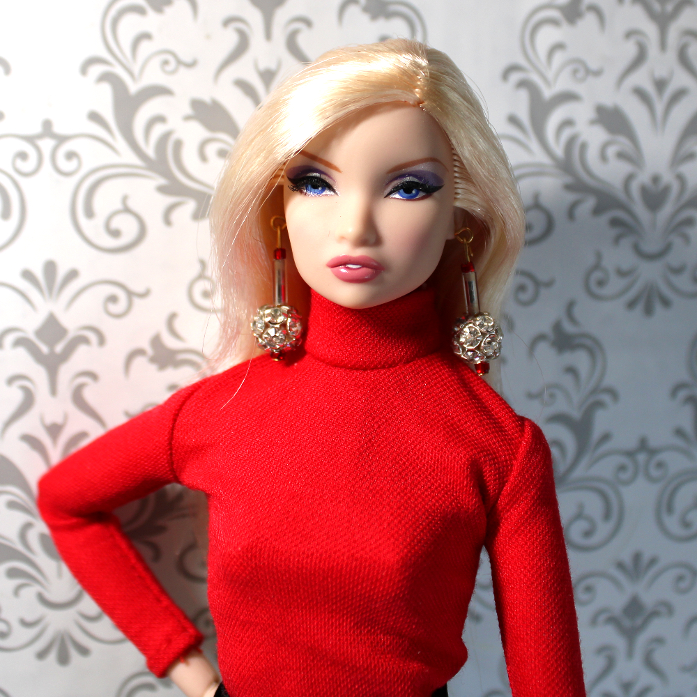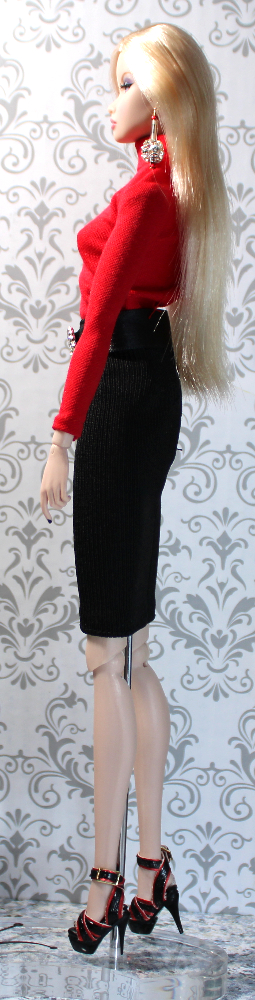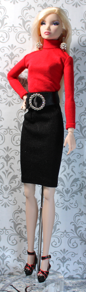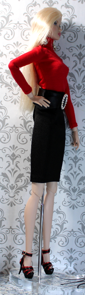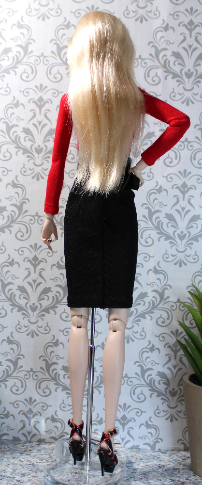 - SKIRT – This slim-fit black stretch nylon-blend pencil skirt has strategic waist tucks to create a high-waist profile. The Velcro-type back closure holds well, and this garment easily fits a variety of standard fashion dolls. On taller dolls like this one, the skirt hem hits a bit above the knee.