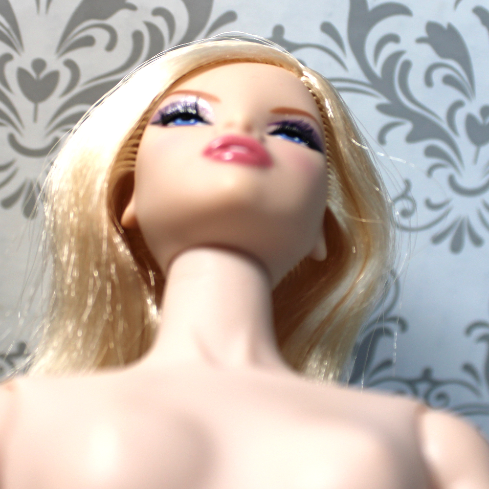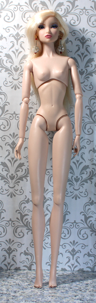 REDRESSED, GREAT CONDITION. This pale-complexion Erin has blue eyes, smoky lavender and silver eye shadow, applied lashes in very good shape, soft salmon-pink lip color, long straight side-parted warm platinum blonde hair, and her original black mani-pedi. Her body type is tall like modern Fashion Royalty dolls, with body shape/style similar to Poppy Parker, but with longer thighs and high heel feet with “split toes” similar to the legacy Fashion Royalty “wasp waist” tall body type. Hands are removable for easy dressing.