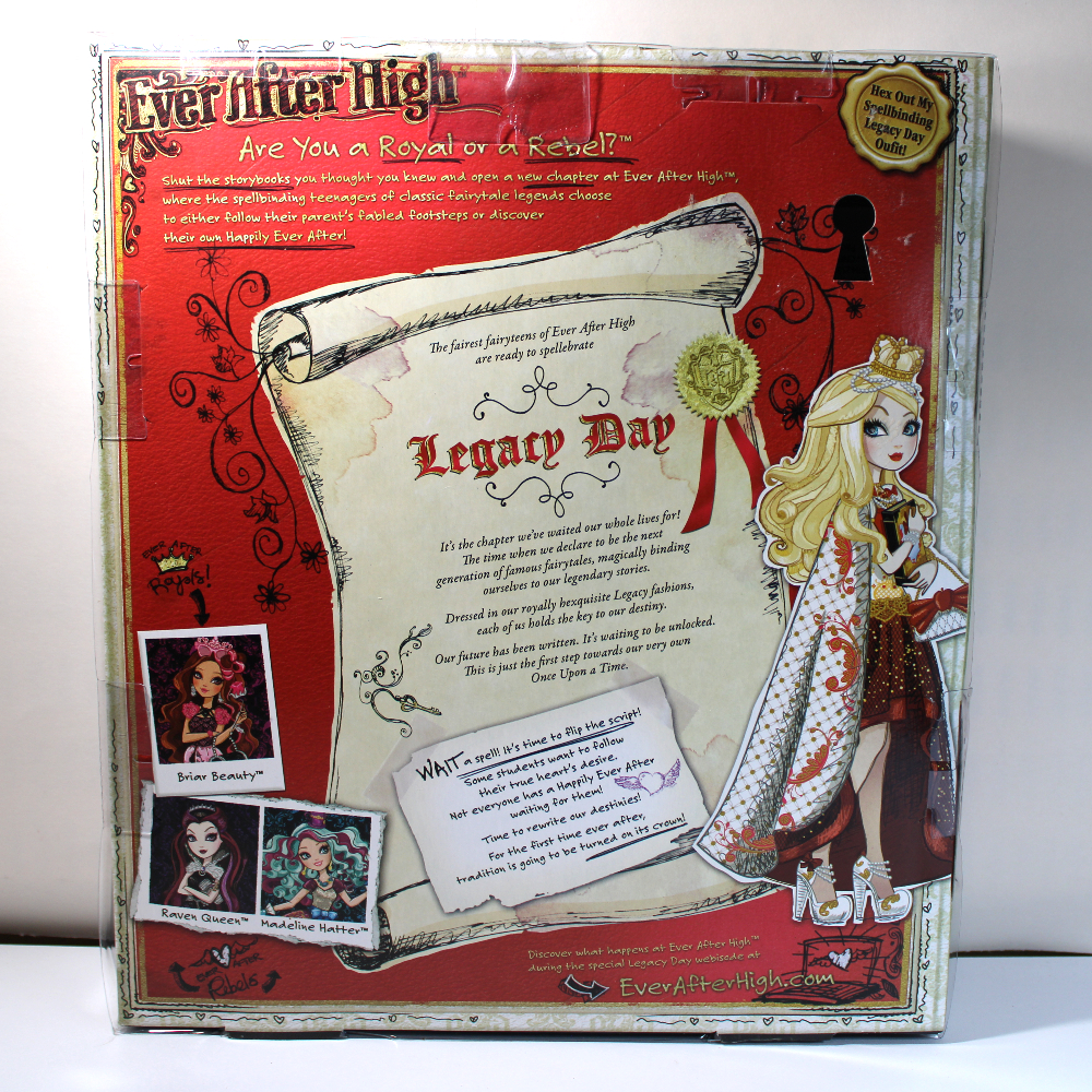 DOLL – Original designed articulated Ever After High doll. Wavy pale blonde hair is side-parted. Wearing elaborate red and white satin gown with gold accents and high-front cascading skirt in red satin with patterned cape. Accessories include white beaded hairpiece topped by gold crown, gold earrings, rose crown, storybook chest with mirror and key, purse, high-heel shoes, bracelets and rose ring, plus hair brush and stand, if included, inside box back.