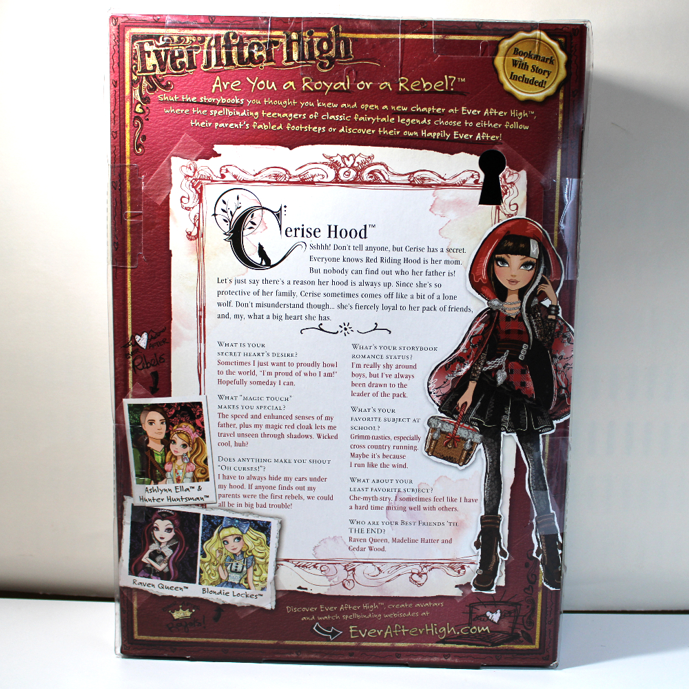 DOLL – Original designed articulated Ever After High doll. Straight black hair with silver streaks is styled with bangs and loose front lock. Wearing red satin and black pattern hooded cloak over red and black plaid dress with black tulle hem ruffle. Accessories include pink ring, black bracelet, brown vinyl belt with silver buckles and dagger, brown boots, molded woven basket (loose in box), plus hair brush and stand, if included, inside box back.