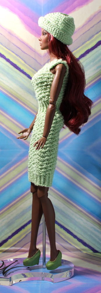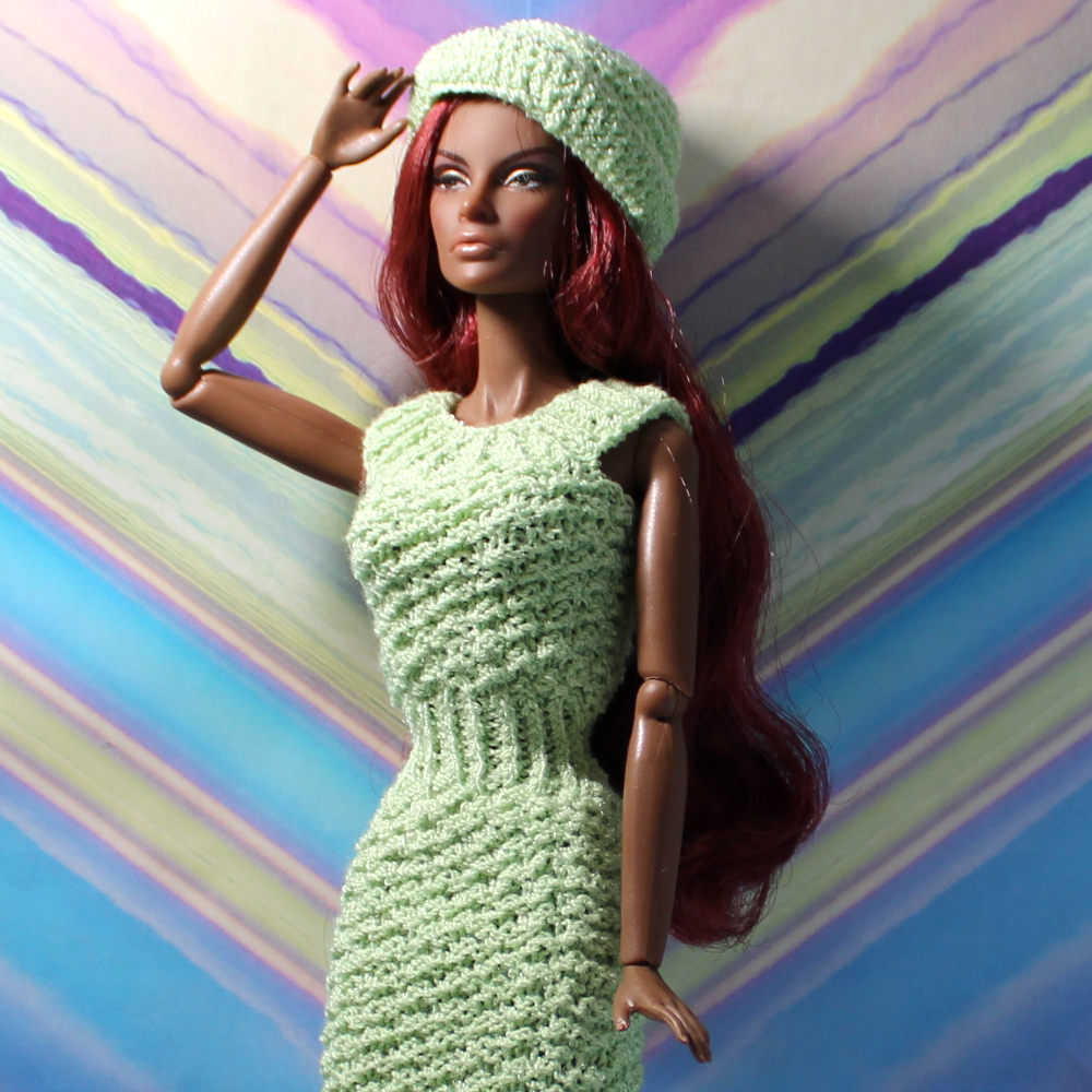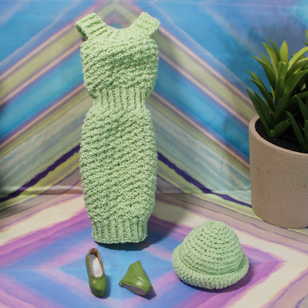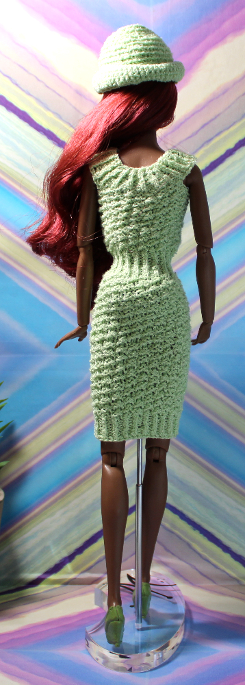 - DRESS – This avocado hand-knit hourglass shaped dress, crafted with soft pliable “new wool” partly synthetic yarn with built-in stretch, slips on and will fit a variety of standard fashion dolls (best for dolls with articulated arms). The hourglass silhouette naturally contours to hug curves and accentuate the doll’s shape for a clean sophisticated look that can go casual or dressy.