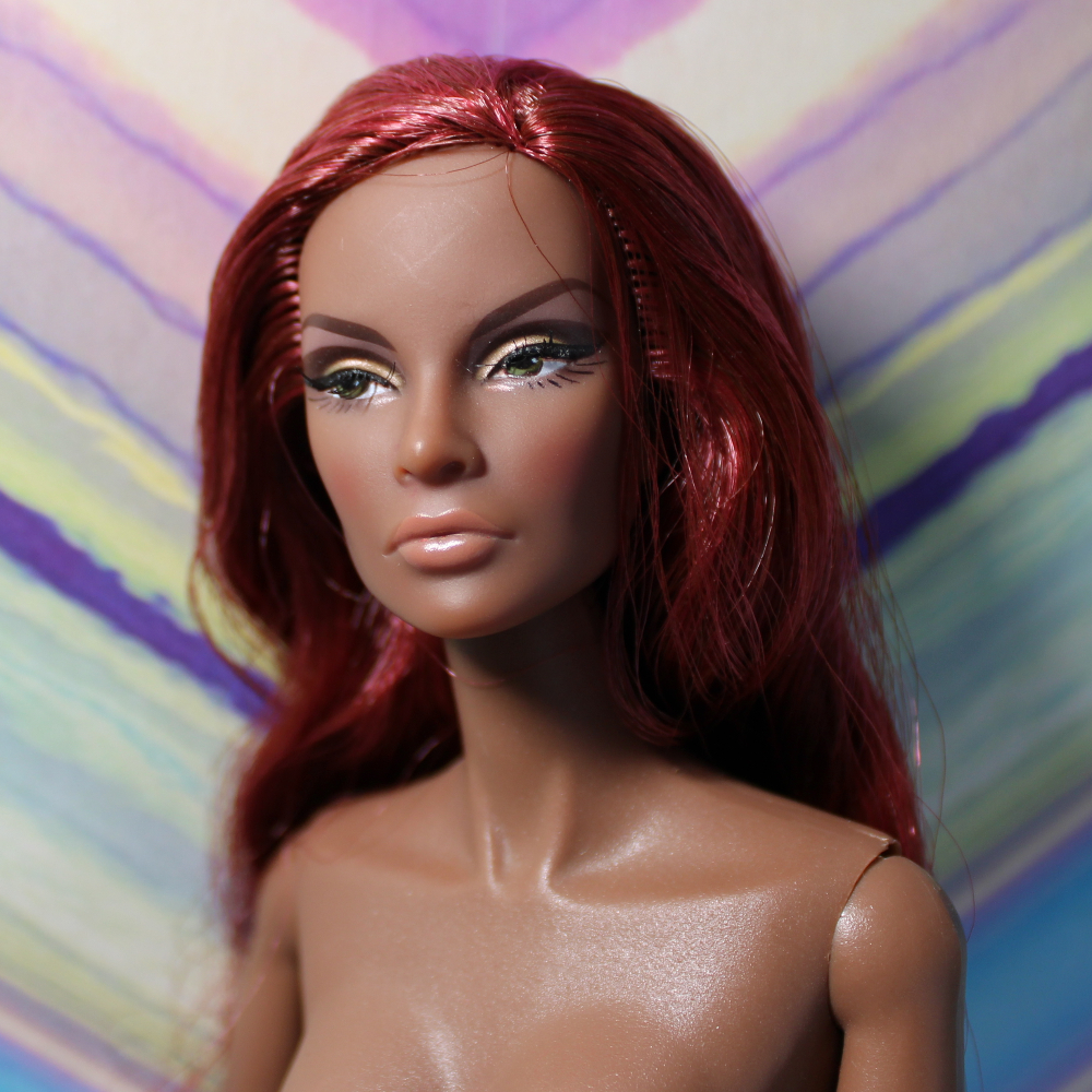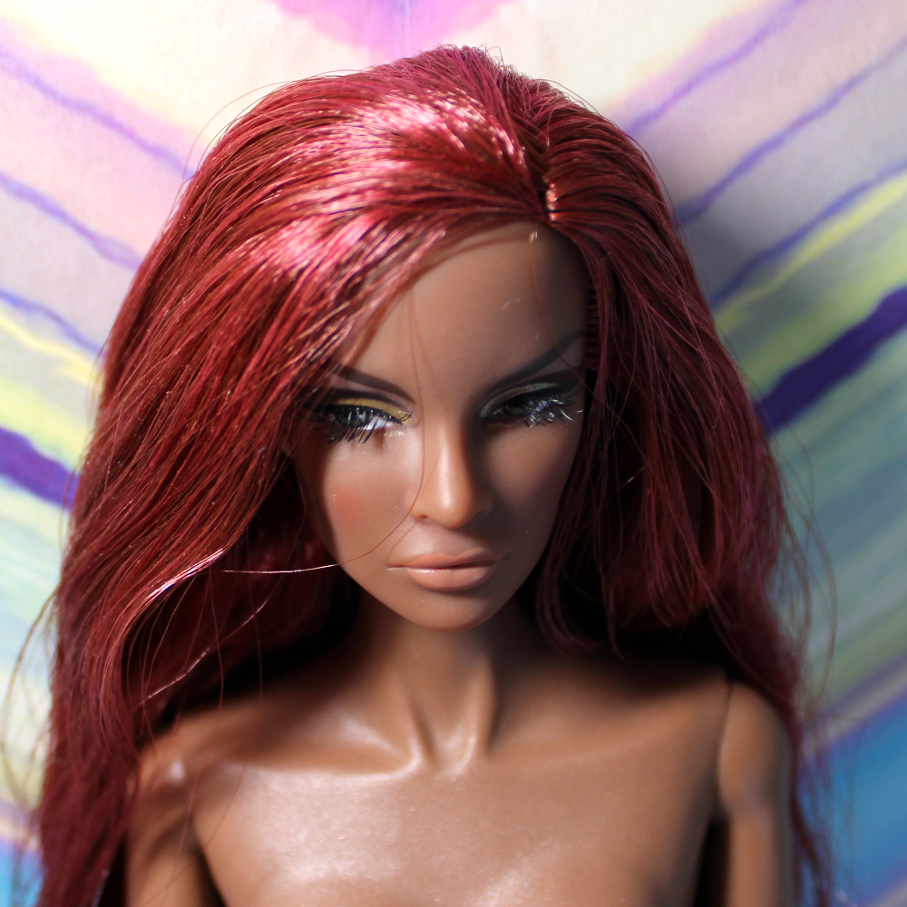 REDRESSED. This stunning Jordan doll is from Integrity Toys’ 2013 Fashion Royalty line with a limited edition of 400. She is all original with intact applied lashes in fairly good shape (could use a little TLC), soft wavy auburn hair, green eyes with gold eye shadow, and comes on her original tall “wasp waist” body with removable hands. She is in great condition with no discernible flaws and comes with clothing and shoes as shown (stand not included):