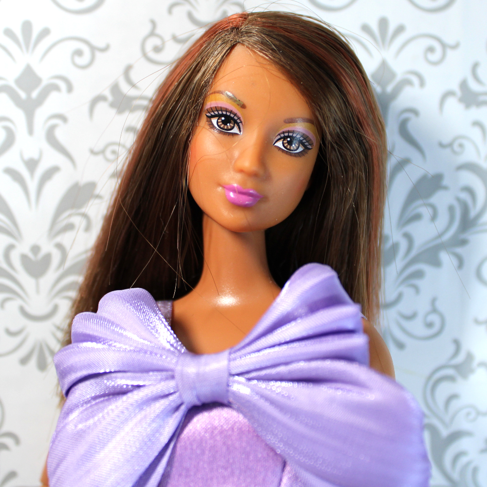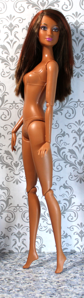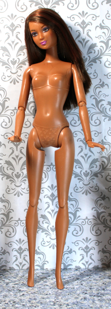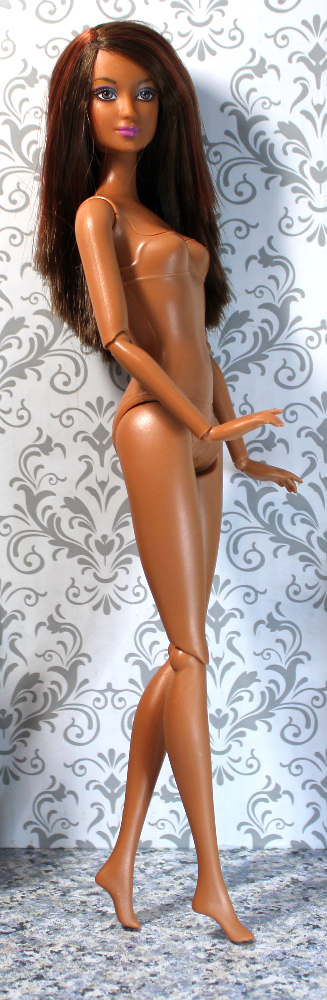 DRESSED, REBODIED. This lovely medium-complexion Lea / Kayla has side-parted waist-length straight streaked auburn/brown hair, light brown eyes, and pale orchid lips with a hint of lavender eye shadow. She’s been rebodied on a tone-matched articulated Fashionista body with a quick-switch button on the back designed to switch head and neck with a compatible doll.*