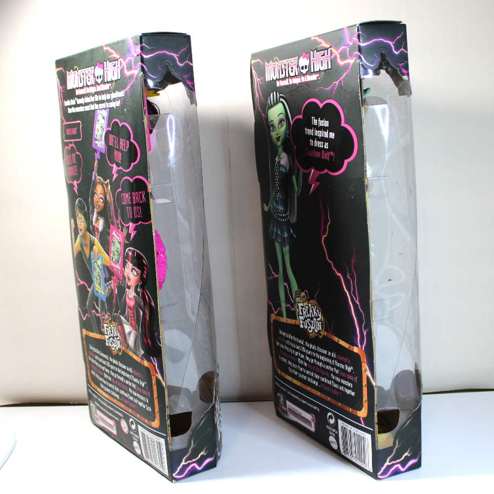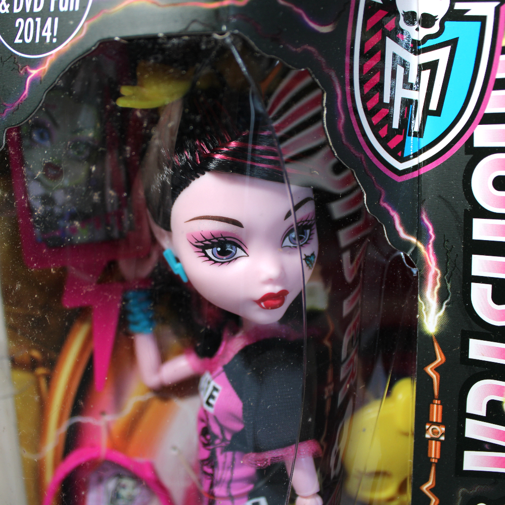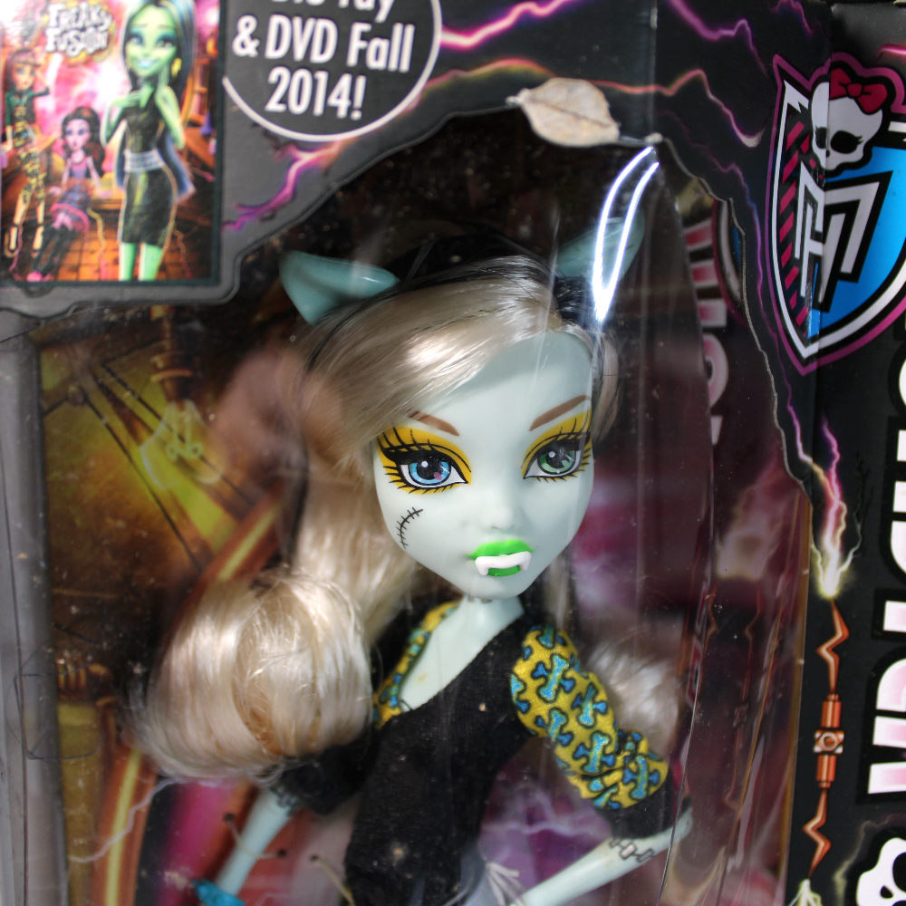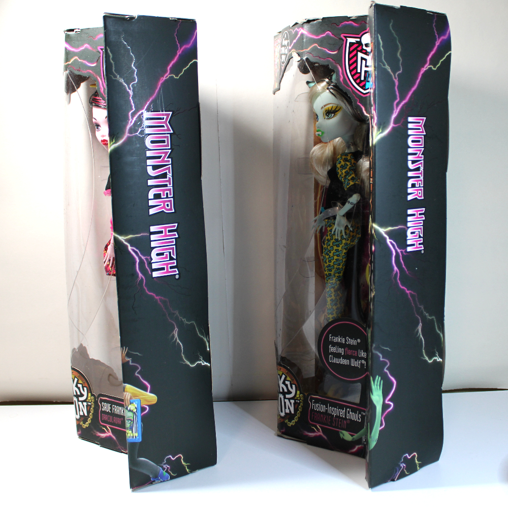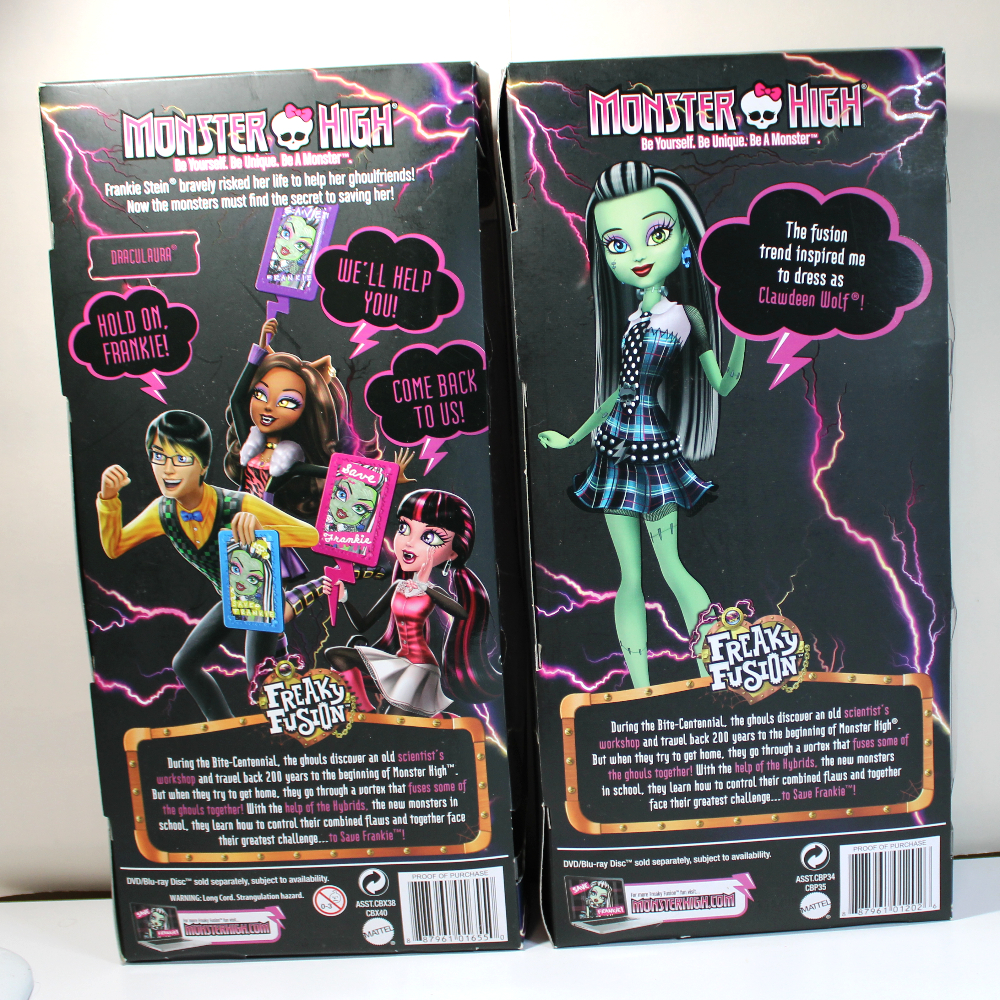NEVER REMOVED FROM BOX, ORIGINAL GENERATION, 2-Doll Lot. This Monster High two-doll lot includes Frankie Stein and Draculaura from the “Freaky Fusion” series. Each comes brand new in original sealed retail box. Boxes are in very good shape with no dings or tears, and show only minor wear/scuffs and a few random surface spots on plastic. Frankie’s purse is loose in box. Boxes are structurally sound, intact, and not yellowed. These dolls are store-shelf condition. NOTE: These dolls have the ORIGINAL Generation-1 articulated Monster High body style, NOT G2 with reduced articulation, and NOT G3 with redesigned bodies.