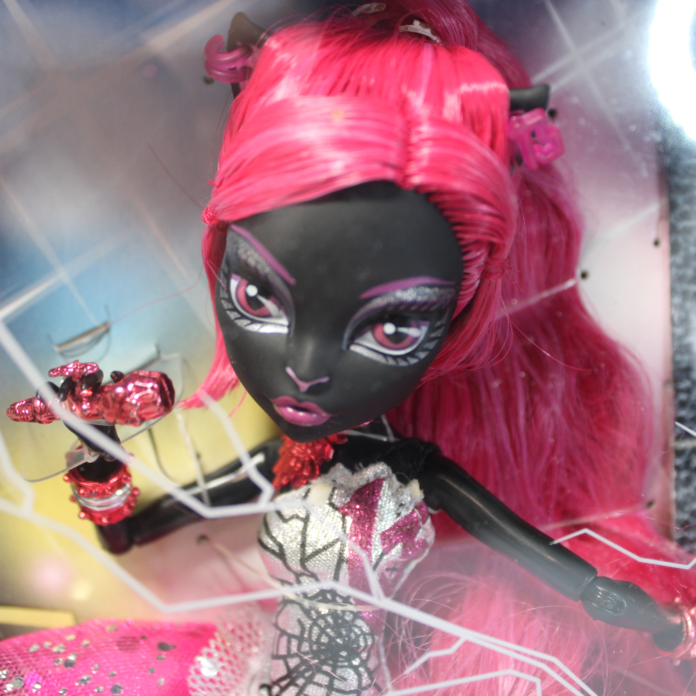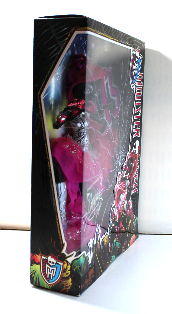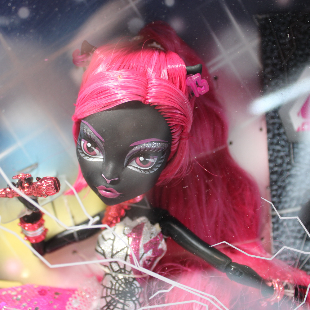 DOLL – This is a G1 doll with original designed articulated Monster High body. Deep pink hair is side-parted and styled in a high ponytail with chin-length side-curtain bangs. She wears a silver metallic pattern dress with a full pink tulle ruffle and pink satin under-skirt that cascades in the back with long streamers. Accessories include metallic pink and silver bracelets, metallic pink microphone, silver metallic boots, plus hair brush and stand.
