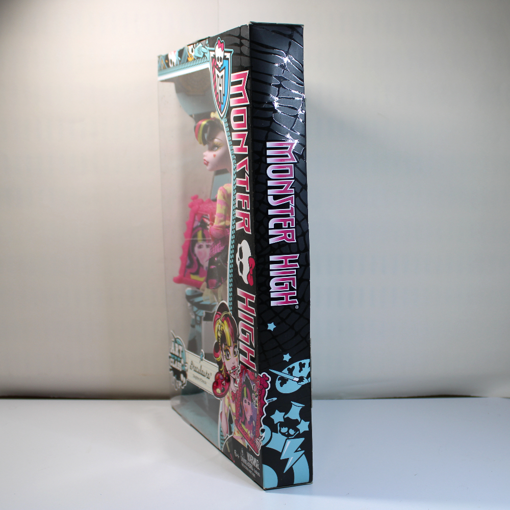 Draculaura comes brand new in original sealed retail package in great store-shelf shape with no visible wear except minor crease on lower front edge and some removable spots on plastic. This is a G1 doll with original designed articulated Monster High body.