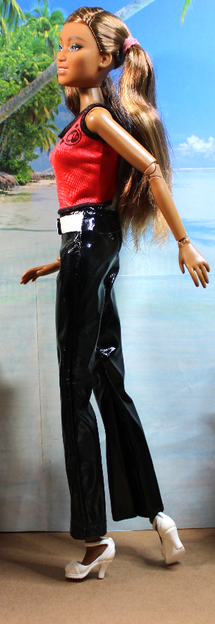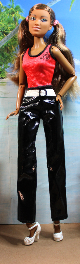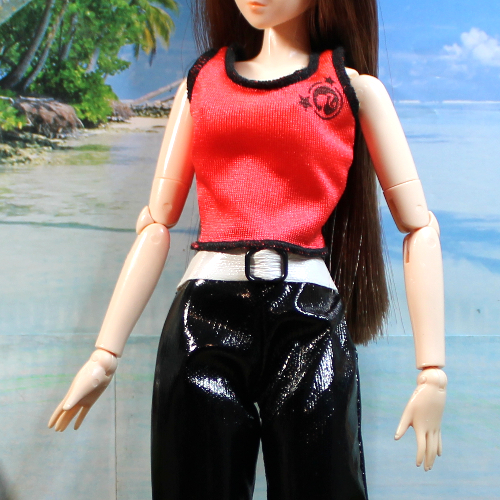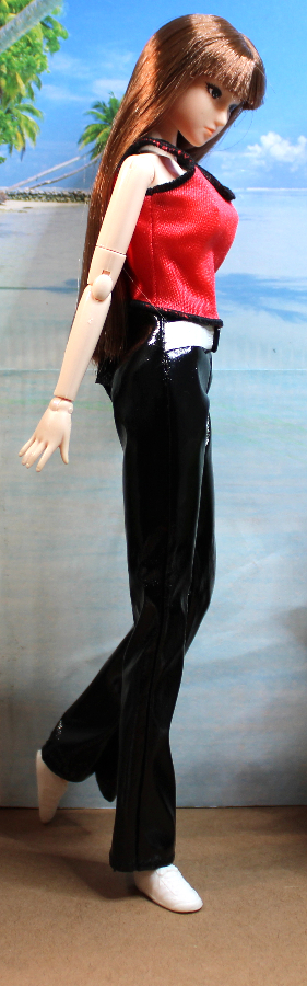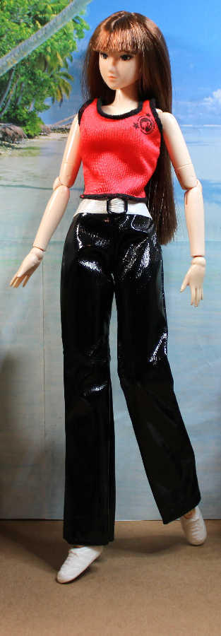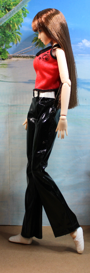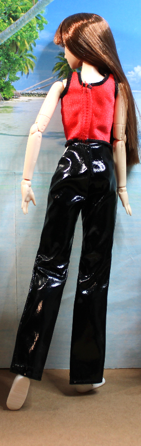 This casual outfit makes a bold statement pairing black patent vinyl trousers with a red nylon strap shirt with black serged trim. The pants sport a white vinyl attached faux belt for extra contrast. Pants and Top have back Velcro-type closures. Shown on an Obitsu body doll – best for shorter slender dolls with similar proportions. Also modeled on a Poppy Parker clone doll.