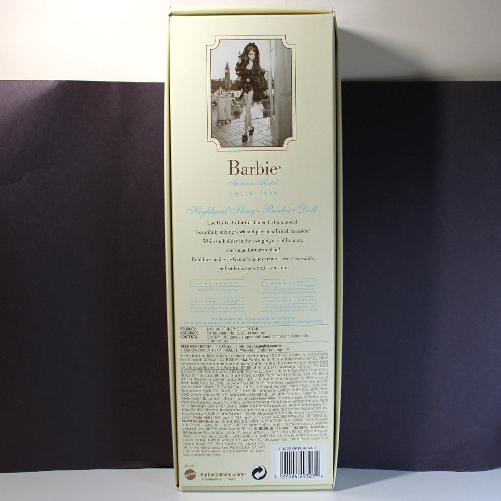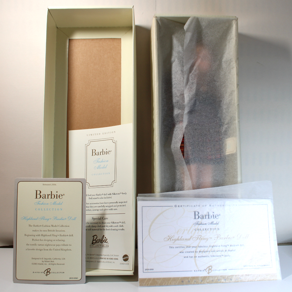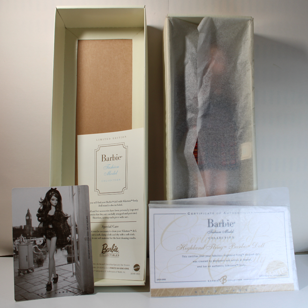 NOTE: Extra pictures of Highland Fling wearing different clothes and showing the nude body style are pictures taken of a different Highland Fling doll, deboxed. See additional description for more info about the Silkstone collector doll line.