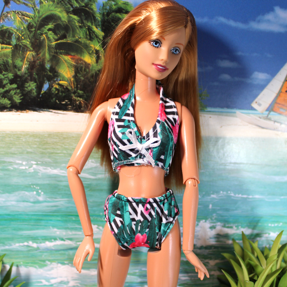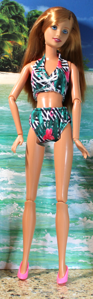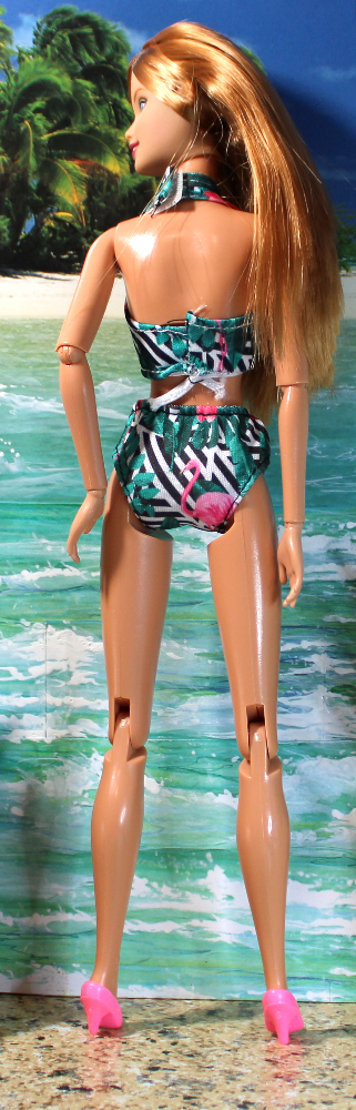This two-piece swim set is constructed of a stretchy nylon-blend in a white background with a striking pattern of green and black palm fronds and pink flamingos. The swim bottoms slip on with an elastic waist, and the top slips on with elastic at the bottom of the bodice. The halter straps fasten at the back of the neck with a Velcro-type closure. Shown on a Mattel articulated belly-button doll, this suit will fit a variety of fashion dolls with similar proportions.