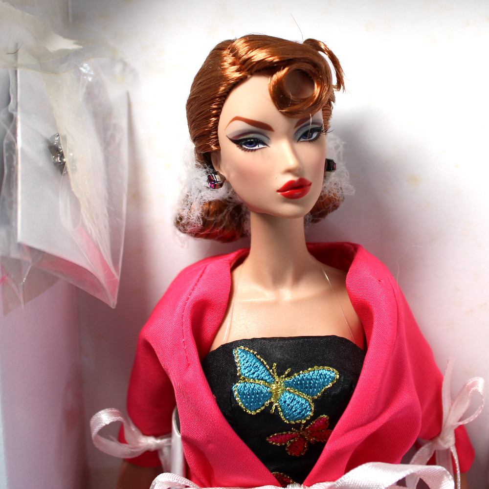 - HAT – Black beaded fascinator hat is shaped like a sleep mask and sits over the top of doll’s head. (May have a fastener mechanism not obvious while inside package. The hat plastic package has come loose inside box.)