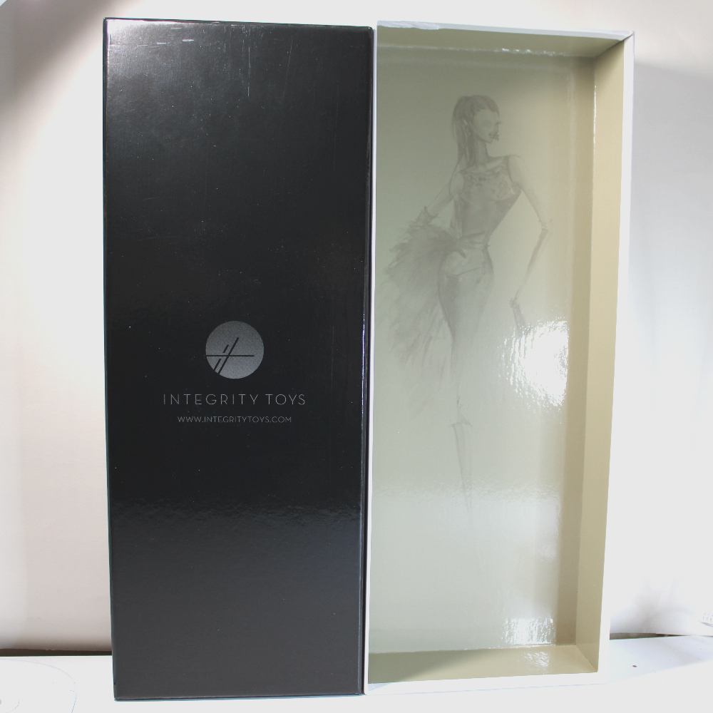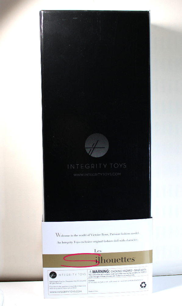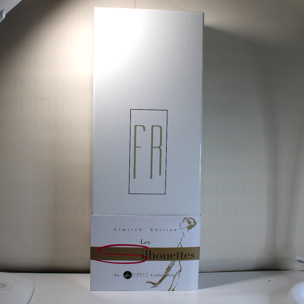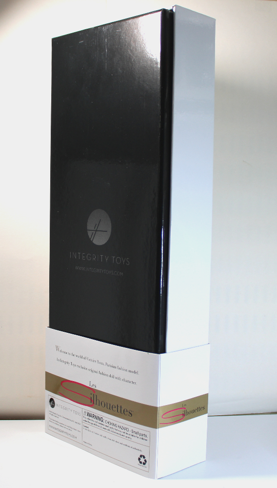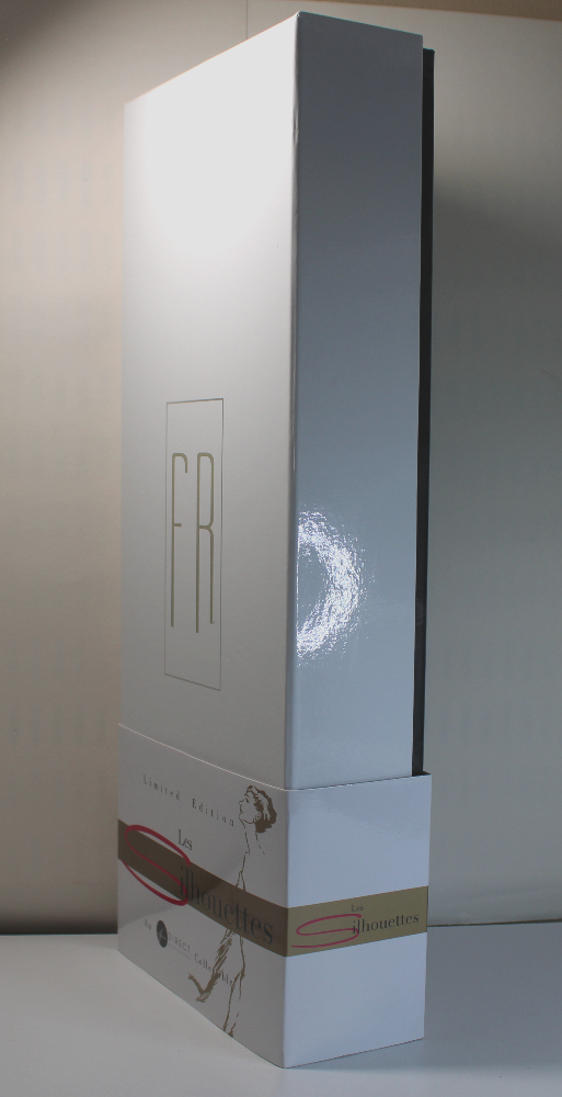 - PACKAGING – NRFB packaging includes the original retail box in great shape, and outer double-wall cardboard factory shipper. Retail box has a gloss white lift-off lid with the “FR” logo stamped in gold. A slip-off paperboard sleeve bears the “Les Silhouettes” branding. The box bottom is gloss black. Doll is secured inside inner box with white ribbons, and all accessories are taped inside along the box inner edges. (The plastic-packaged hat has come loose and is included inside.) The stand base is secured behind the doll’s legs, and the stem and supports are secured inside the left-face corner of the inner box. The doll will come NRFB inside the retail box wrapped in a clear cellophane sleeve inside the original shipper. If shipped separately, the shipper will be bubbled wrapped and covered with poly-bagging.