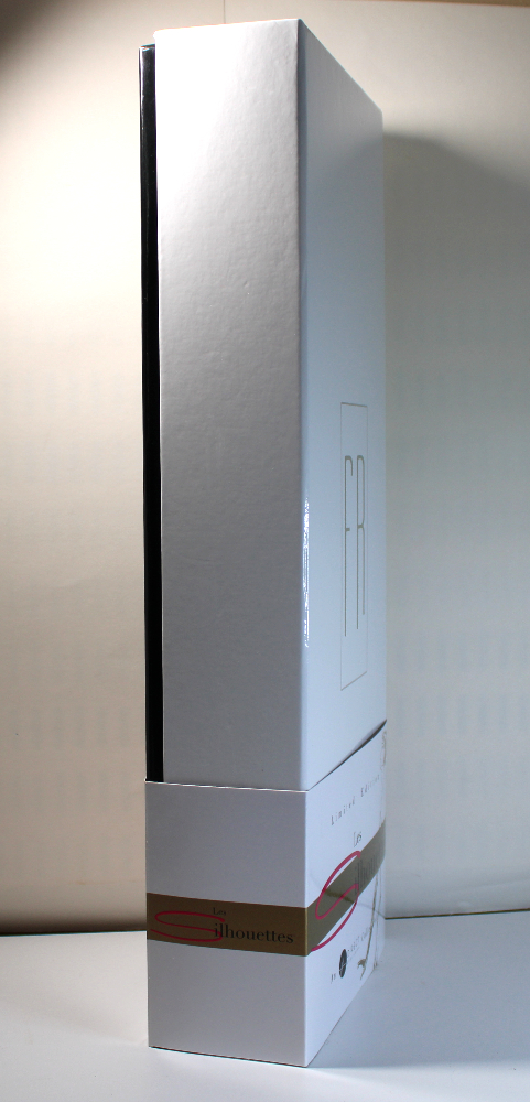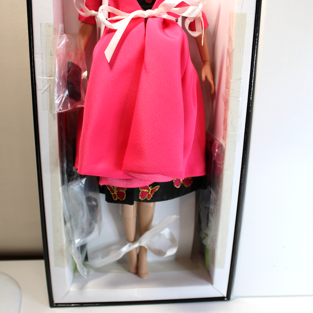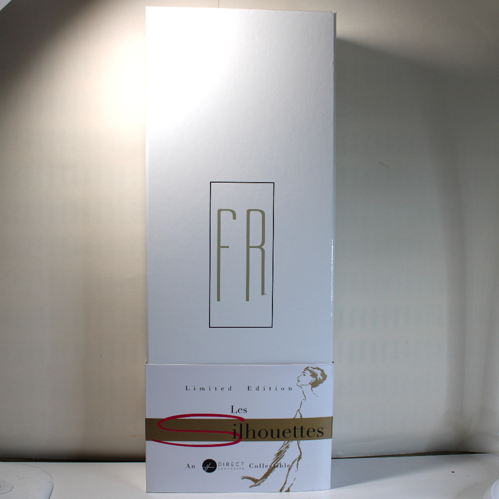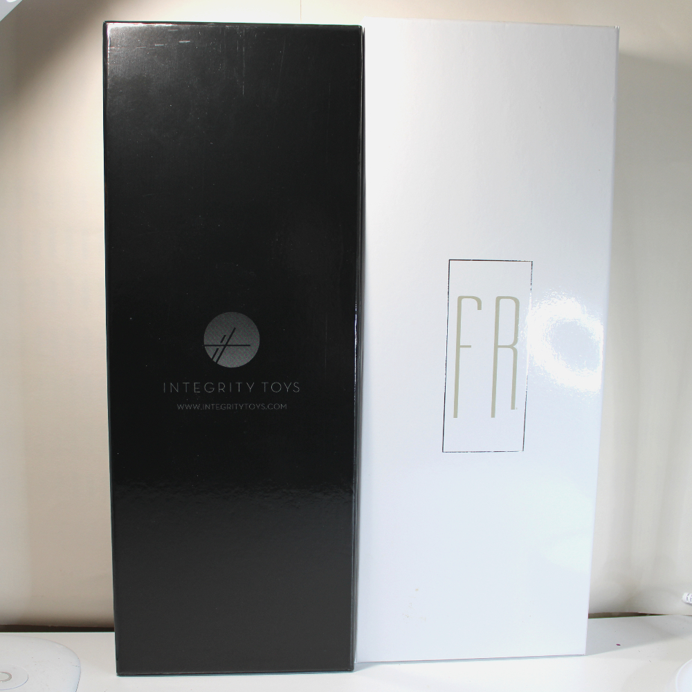 - PACKAGING – NRFB packaging includes the original retail box in great shape, and outer double-wall cardboard factory shipper. Retail box has a gloss white lift-off lid with the “FR” logo stamped in gold. A slip-off paperboard sleeve bears the “Les Silhouettes” branding. The box bottom is gloss black. Doll is secured inside inner box with white ribbons, and all accessories are taped inside along the box inner edges. (The plastic-packaged hat has come loose and is included inside.) The stand base is secured behind the doll’s legs, and the stem and supports are secured inside the left-face corner of the inner box. The doll will come NRFB inside the retail box wrapped in a clear cellophane sleeve inside the original shipper. If shipped separately, the shipper will be bubbled wrapped and covered with poly-bagging.